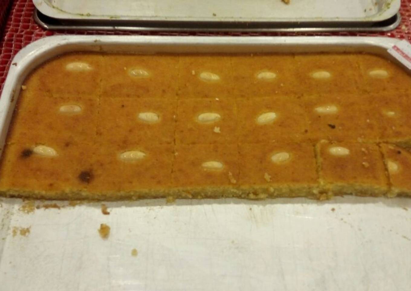 - Pour and level out the batter in a greased 11x7 inch pan and lightly score the top with diamond or square shaped cuts. Press a whole almond in the middle of each square or diamond. Then cover and set the pan aside for half an hour. This helps the semolina to absorb the liquids. In the meantime, preheat the oven at 180 C.
