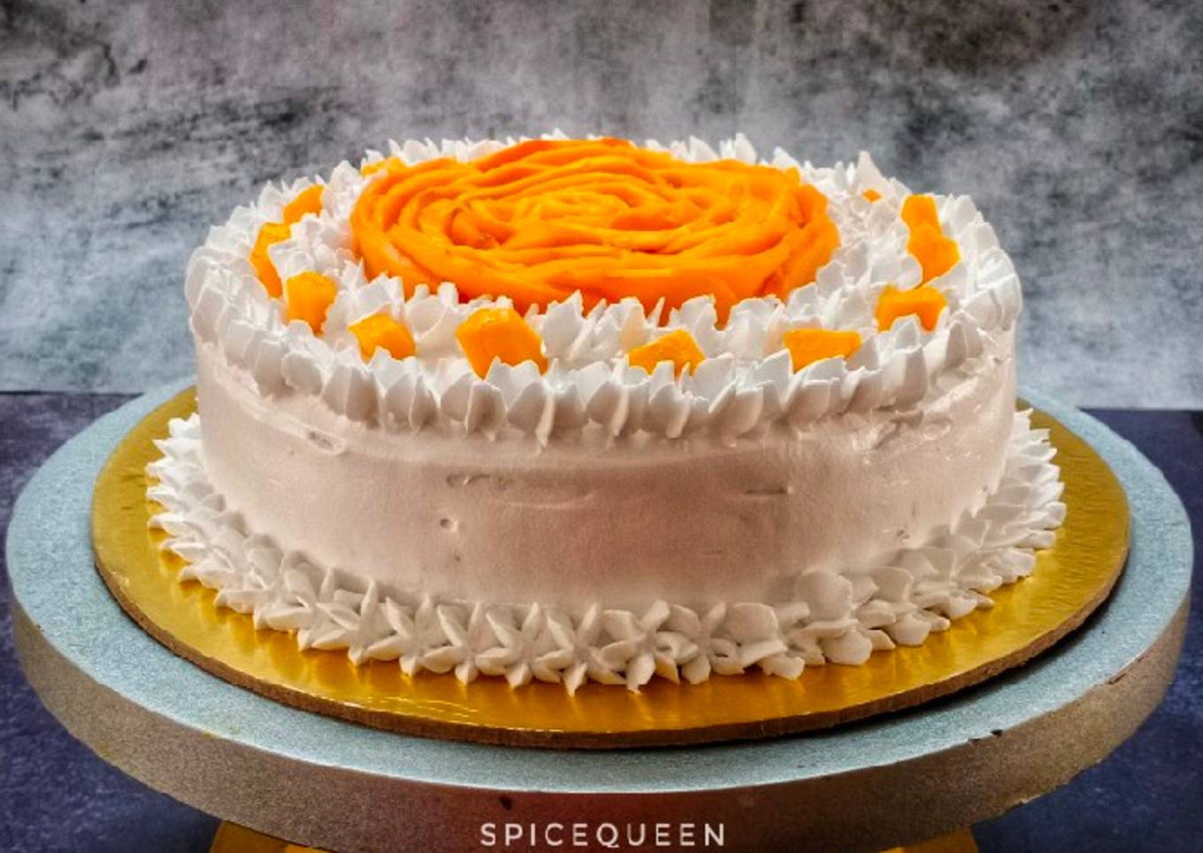 - Now cut the cake into three circles. Whip the cream until it forms stiff peaks. Now take one circle and apply cream evenly. Spread half of the mango pieces on top. Now repeat with the second layer and cover it with the third layer. Now cover the whole cake with the cream evenly. Decorate it the way you like. Make a flower in the middle using thin mango slices.
