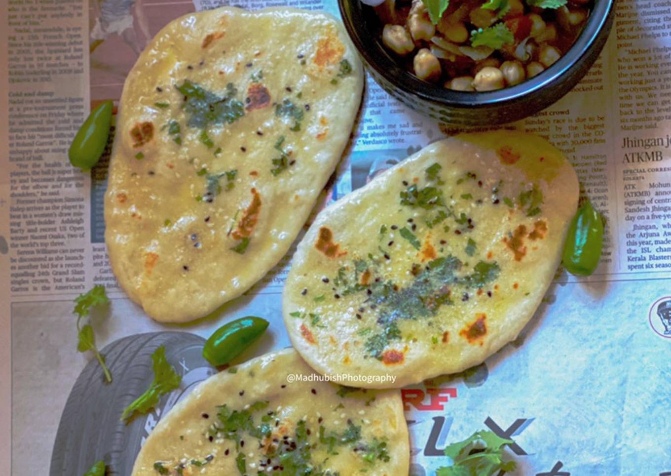 - In a semi hot tawa place the side which has no coriander leaves and on low flame keep it on, bubbles will arise. Flip side and cover the tawa. 2-3 mins the Kulcha will be done