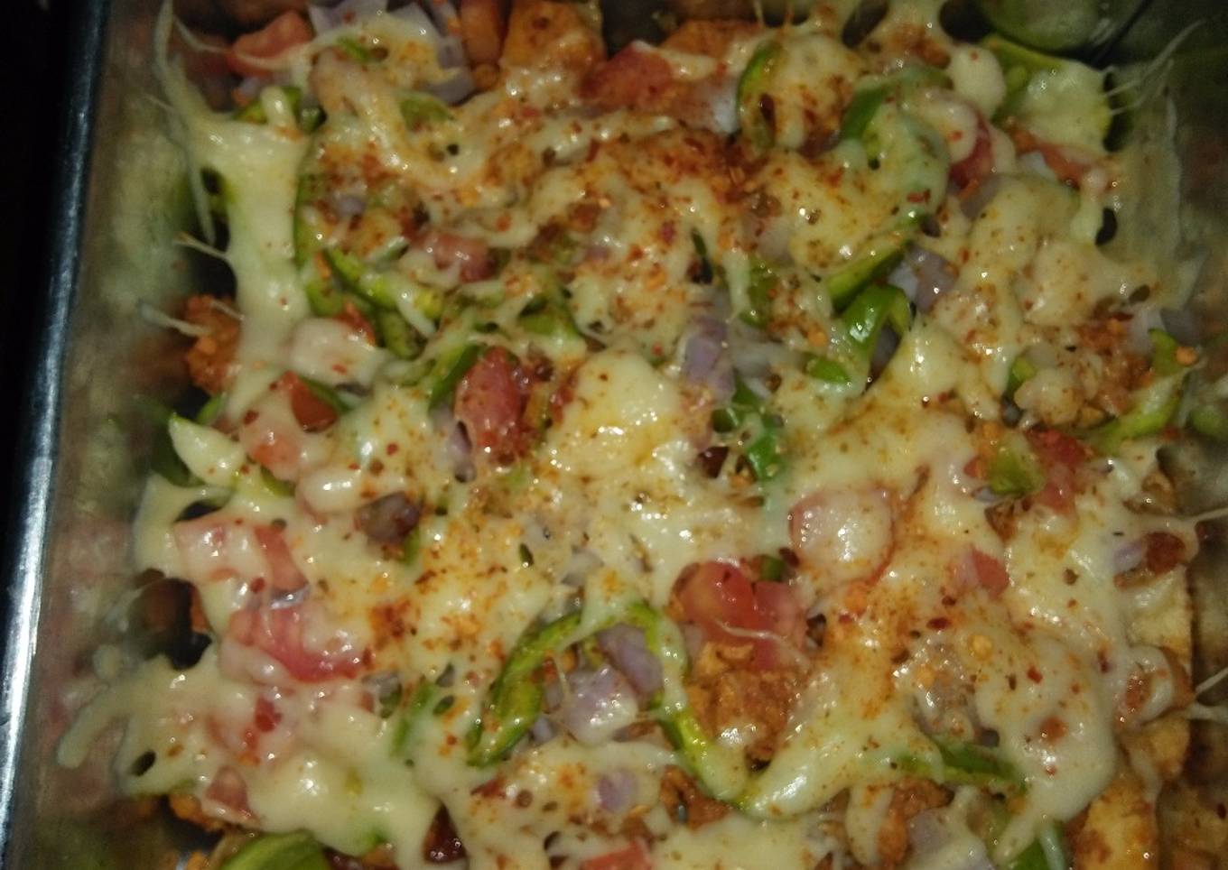 - Now grease the pan and assemble all the things. Firstly put first layer of fries and then some cheese on it. Then add chicken and pizza sauce on it and then add vegetables and cheese on it to cover it properly. After that sprinkle some red chilli powder and oregano above it.