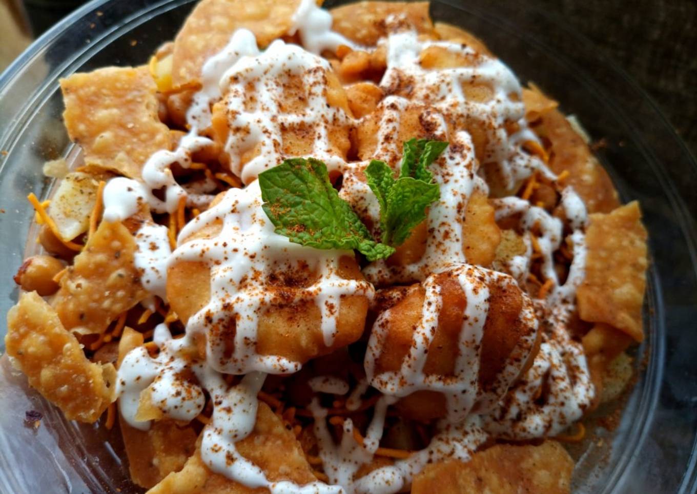 - In serving plate, add papri, fritters, chickpeas, salt, red chili crushed, chaat masala, tamarind chutney, yogurt, sev nimco, fresh mint & serve!