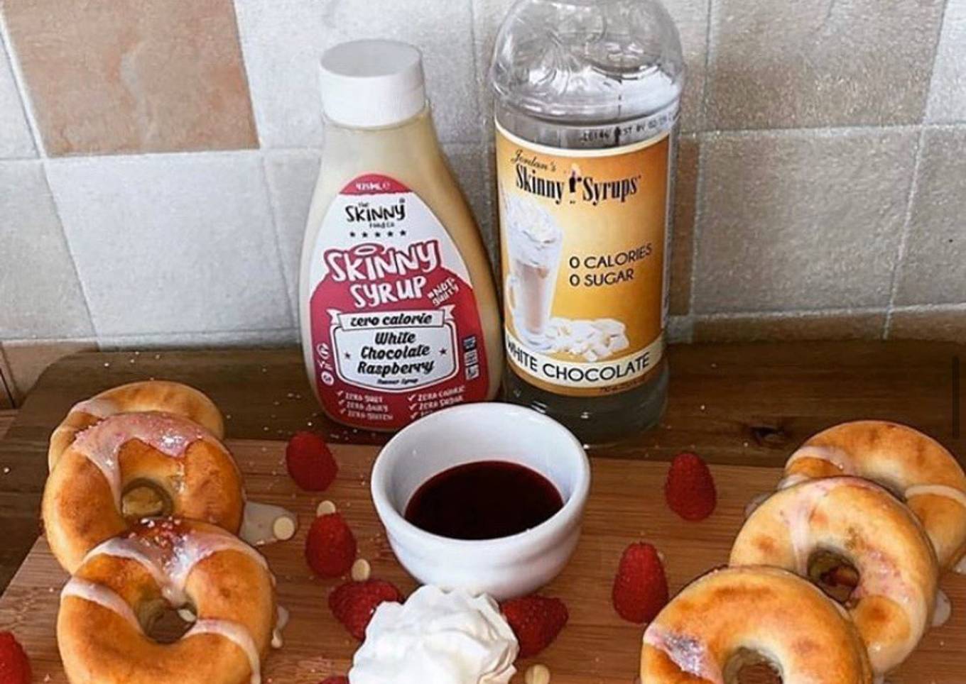 - Served with - 2 tbsp raspberry coulis with a sprinkle of shimmer sugar. Drizzle of @SkinnyFoodCo White Chocolate and Raspberry Syrup, Squirty Cream, Raspberries and 5g White Chocolate Drops
