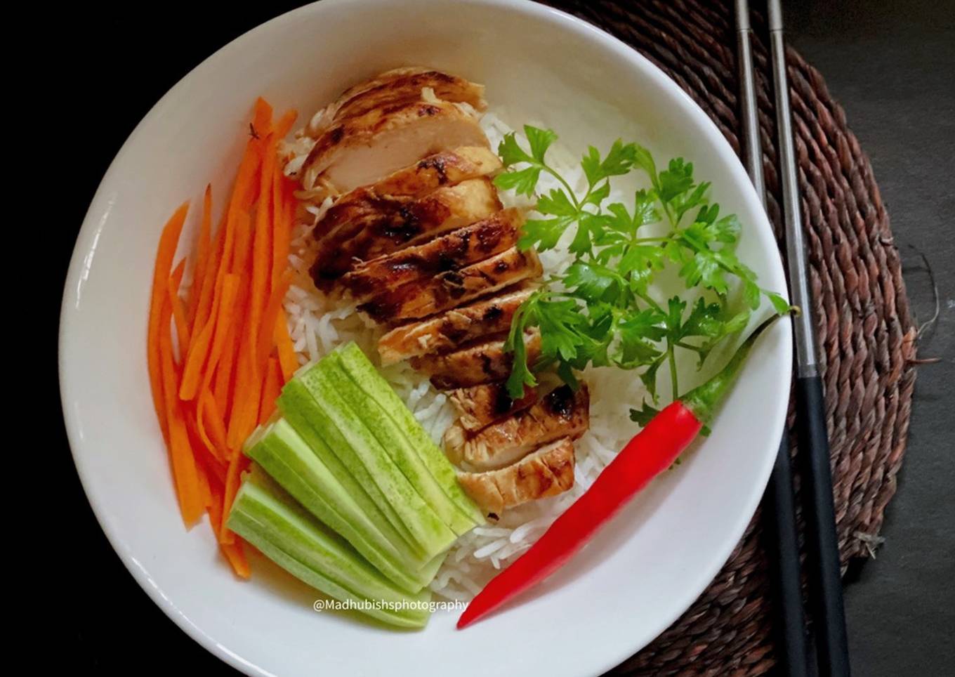 - To plate in a bowl add steamed rice, place the grilled chicken breasts slices diagonally, carrot julienned on sides, cucumber julienned on sides, parsley on sides and red chilli.