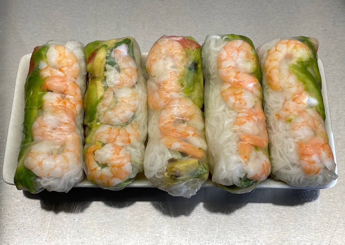 - For the next step, I developed a three-layer technique which will make this process easier. In a row across the lower centre, add a small amount of rice vermicelli and a few lettuce and mint leaves on top. Then place a few sticks of peppers, avocado above that, and then place 4 shrimp halves above that. Leave about 1 inch uncovered on each side. Do not overstuff the roll.